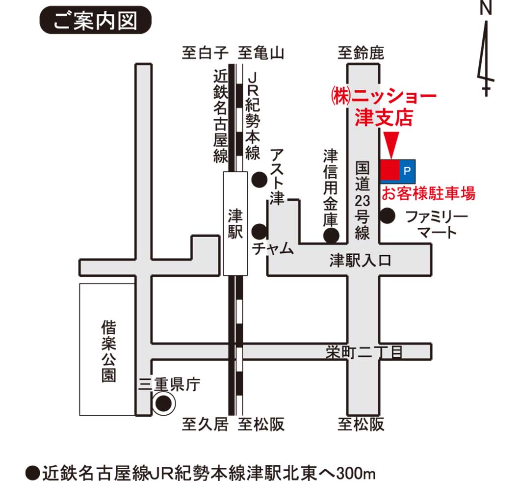 A近鉄名古屋線津駅・JR紀勢本線津駅北東へ300mです。